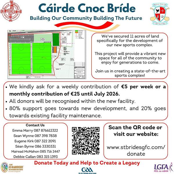 Hi all, you may have seen that the four clubs launched a joint initiative on Friday called “Cáirde Cnoc Bríde”. This is to support the new planned development and to improve the facilities in our community. We will have members in the pitch each evening this week with information brochures, to answer any questions you may have and to guide you through the sign up process. Visit www.stbridesgfc.com/donate for more information.